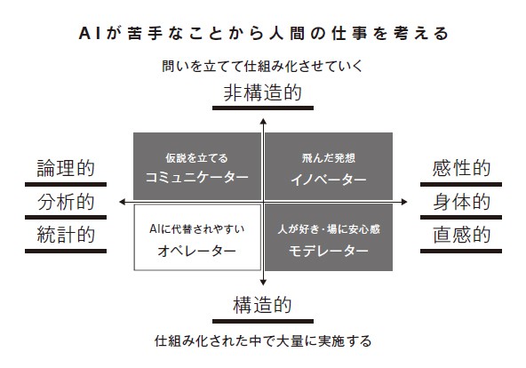 AIに代替されない、人にしかできない価値を考える際、AIが苦手な領域に目を向けてみるとよい。そこで次のようなマトリクスをつくる。横軸の左側には、「論理的・分析的・統計的」を、右側には「感性的・身体的・直観的」をおく。次に縦軸の下には、仕組み化された中で大量に実施する能力「構造的」を、その対極には、問いを立てて仕組み化を行う能力「非構造的」をおく。こうしてできた4つの区分のうち、AIが得意とするのは左下の領域である。コンピューターは「疲れない」「飽きない」ため、高速かつ大量に同じことをくり返してくれる。