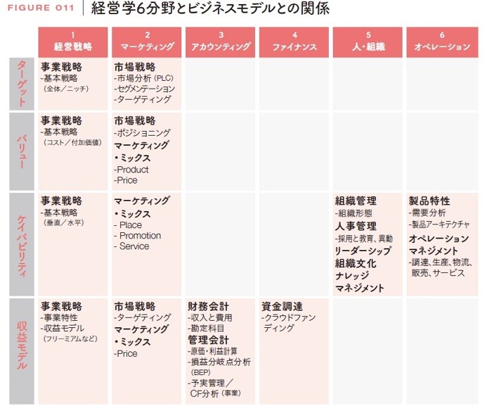 これまでの経営学6分野と、本書のビジネスモデルの関係を表したのが、「経営学6分野とビジネスモデルとの関係」の図である。大ざっぱにいえば、事業経営では、ターゲットとバリューを定めるために、経営戦略とマーケティングを学び、ケイパビリティの設計とその実現のために、人・組織とオペレーションを学ぶ。さらに、収益モデルをつくり上げていくために、アカウンティングを学ぶ。これが経営学を学ぶ目的である。