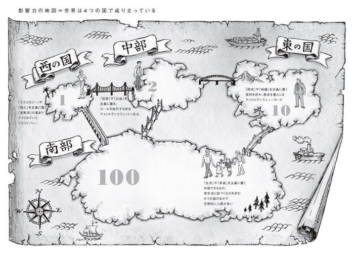 認識の地図の中で、世界は「4つの国」に分けられる。まずは技術と変化の「西の国」。アメリカでいうシリコンバレーのような革新派の集まりで、最先端のものを生み出していく。