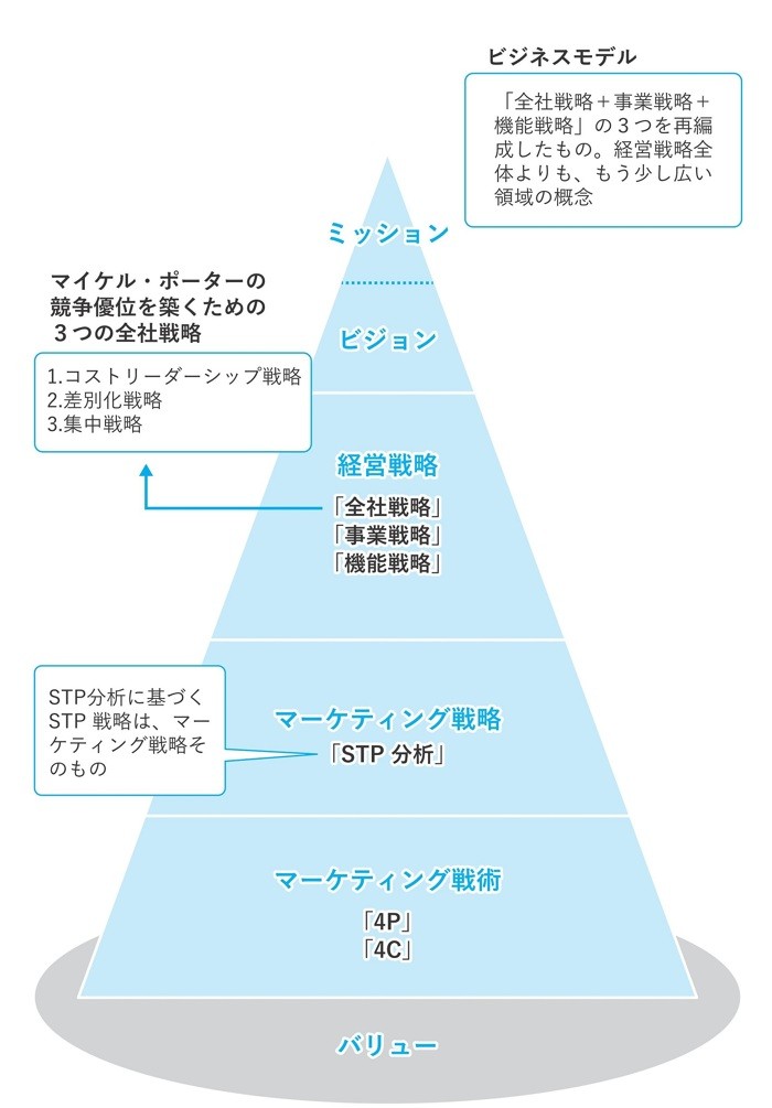 本書では、戦略4.0を読み解くために、「戦略」についても解説されている。著者によると、「戦略の全体構造」は三角形で、下から「マーケティング戦術:4P、4C」、「マーケティング戦略:STP分析」、「経営戦略:全社戦略、事業戦略、機能戦略」、「ビジョン」「ミッション」となっており、三角形の土台には「バリュー」がある。要約ではそのうち「経営戦略」「ミッション」「ビジョン」を紹介する。