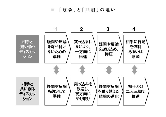 本書では、競争ではなく共創、疑問や反論を活かして結論を進化させるディスカッションをめざす。共に創るディスカッションには、それを支える7つのスキルがある。