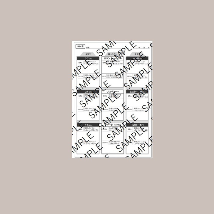 神メモは大きく分けて4つの要素から成り立っている。「ロマン(ミッション・ビジョン)」、「ソロバン(本業)」、「チャージ(成長や喜び)」、「タスク」である。これらの項目を9つの枠に振り分け、さらに各項目を「仕事上」と「プライベート」に分けて書き入れていく。