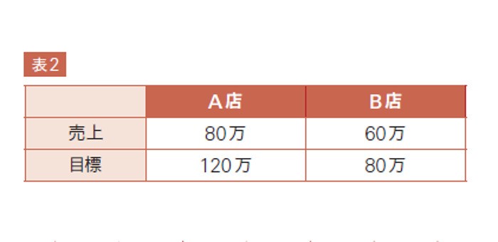 ここに売上目標が入ってくると状況は変わる。A店の実際の売上が80万円で、売上目標が120万円だった場合、その差額は40万円だ。目標の達成率は約0・67となる。一方でB店の売上が60 万円、売上目標が80万円だったとすると、差額は20万円で、達成率は0・75だ。こうしてみると、売上目標に対する差分が大きく、達成率が低いA店に注目する必要があることに気づく。
