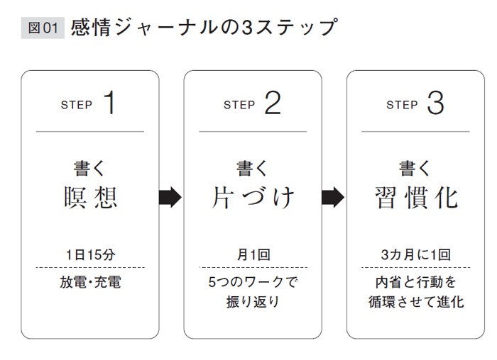 感情ジャーナルは、3つのステップから成る。目的は、気分・気持ちを整え、欲求・欲望を明確にして満たし、願望・価値観から未来を描いていくことだ。