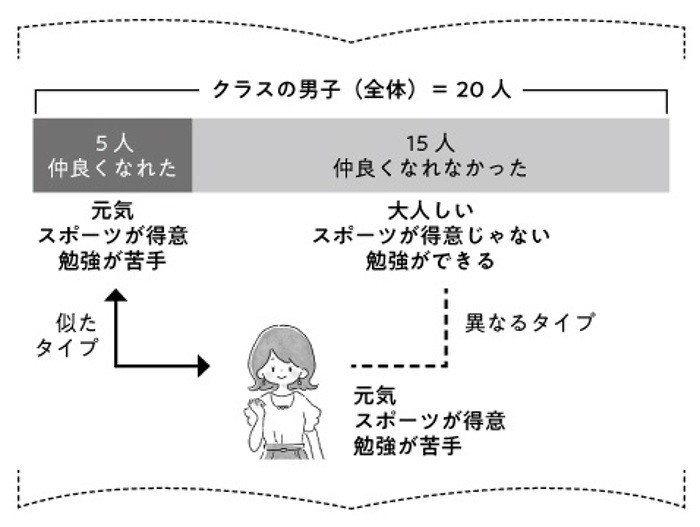 (悩み:男子15人と仲良くなれていない)=(理想:男子20人と仲良くなる)-(現実:男子5人と仲良し)
