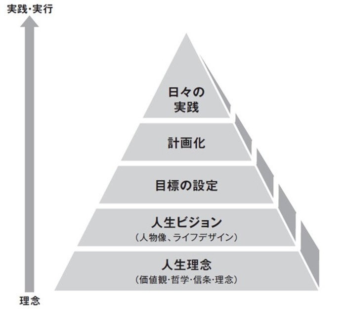 ピラミッドの土台にあるのは「人生理念」だ。ブレない自分の軸として、あらゆる物事を判断し、選択する羅針盤になる。その上には、将来のあるべき姿「人生ビジョン」があり、人生ビジョンを実現するための長期、中期、短期目標が積みあがっている。
