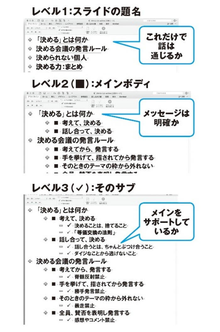 「聴いてわかる」資料にするために、パワーポイントやMSワードの「アウトライン機能」を活用しよう。この機能を使って、レベル1はスライドの題名、レベル2はその下のメインボディ、レベル3はそのサブといった具合で、言いたいことの階層を整理する。