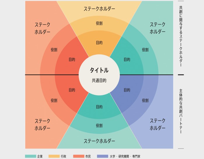 一番外側のエリアには「ステークホルダーの名称」を入れる。ステークホルダーを「企業」「行政」「市民」「大学・研究機関・専門家」に分類し、4色に塗り分けて、それぞれの位置に配置する。