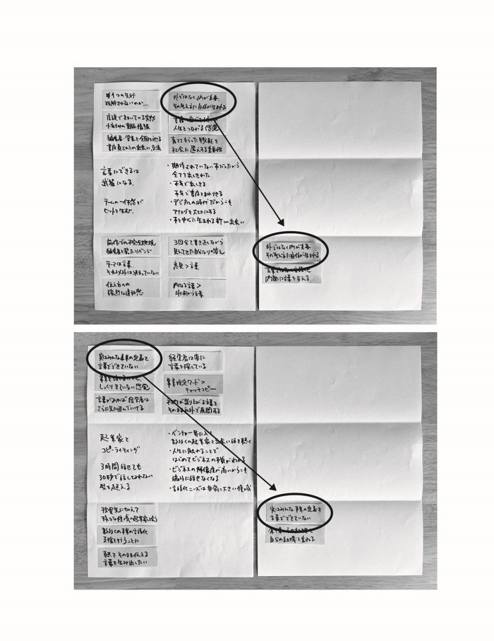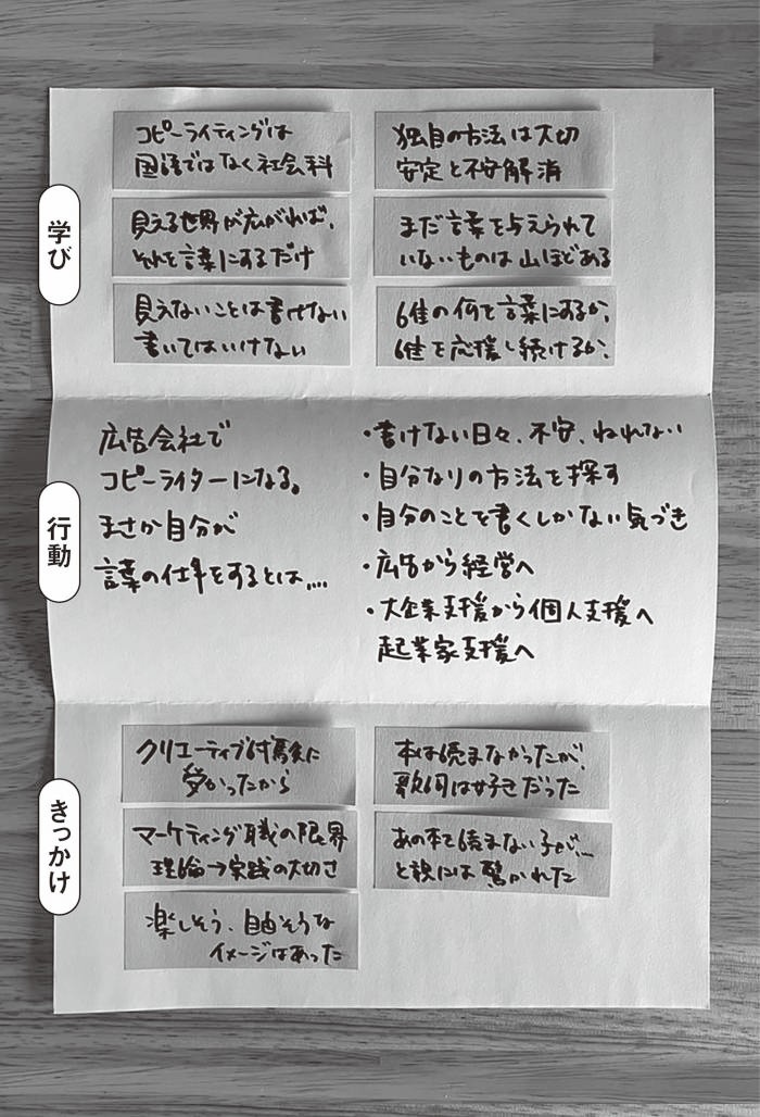 規模の大小や期間の長短などは関係なく、思い出深い行動や分岐点とも呼べるような出来事をとにかく書き出すのがポイントだ。著者の場合、「広告会社でコピーライターになる」「獣医志望と受験失敗、仮面浪人へ」「育休取得と見える世界の変化」といった行動が並んだ。