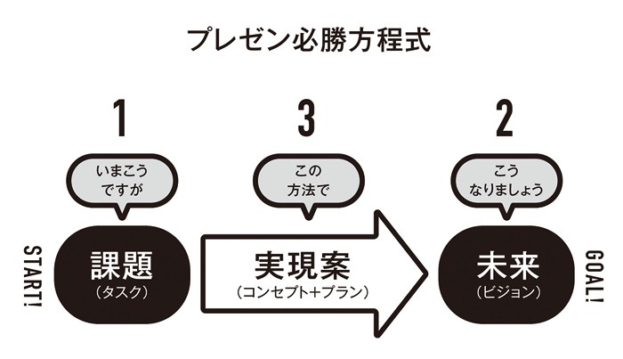 プレゼンの正しい「姿」は「目的達成に向けて、やるべきことを考え、相手にその思いを届け、共感を生み、ともに行動するきっかけになること」だ。行動のきっかけとなるプレゼンには、必勝方程式とも言うべき「型」がある。それは「課題→未来→実現案」だ。まず課題(タスク)を整理し、ゴールとしての未来(ビジョン)を描き、最後にその未来を実現するための実現案(コンセプト+プラン)を提案する。