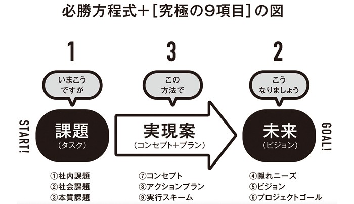 プレゼンの説得力を高めたいなら「究極の9項目」を押さえればいい。この9項目は、必勝方程式の「課題→未来→実現案」を細分化したものだ。「課題」「未来」「実現案」の3つのパートに分けて説明する。
