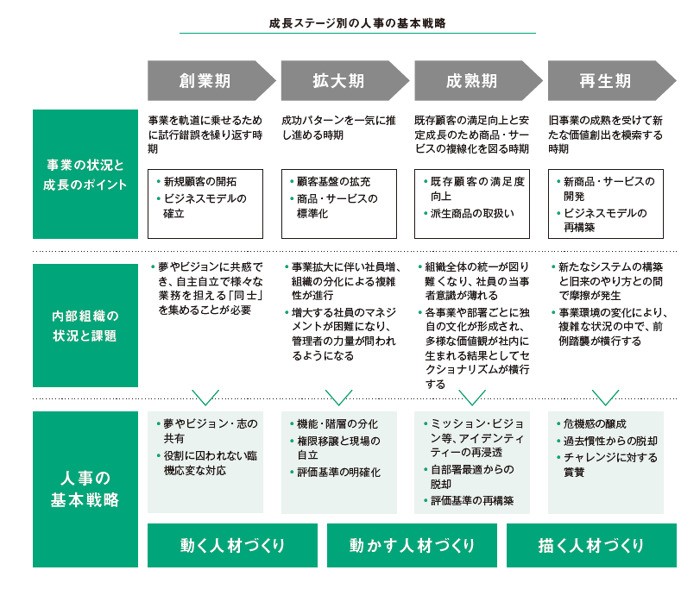 例えば創業期ならば、成長のポイントは新規顧客の開拓とビジネスモデルの確立にある。組織の課題は、夢やビジョンに共感でき、自主自立で様々な業務を担える「同士」を集めることだ。人事の基本戦略としては「夢やビジョン・志の共有」や「役割に囚われない臨機応変な対応」となるだろう。