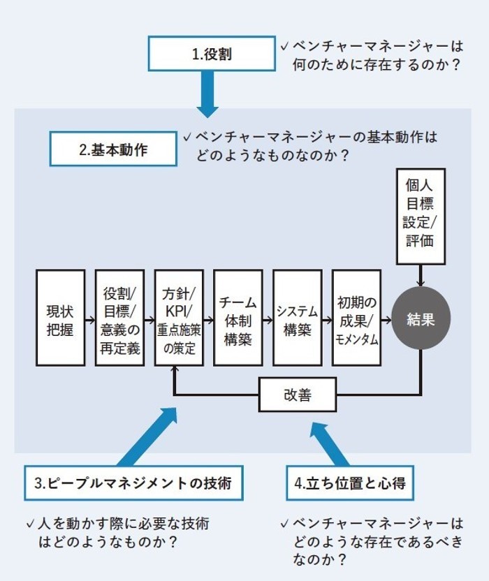 長村氏は業務の範囲も定義も曖昧なマネジメントについて、ベンチャーにおけるマネジメントに絞り、ノウハウの体系化を試みた。そうして開発したのが「マネジメントの地図」だ。マネジメントの地図は4つの大項目から成る。