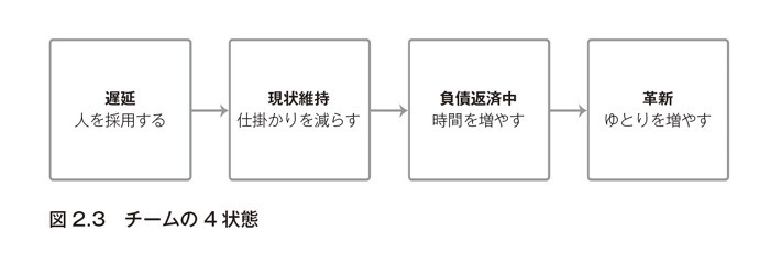 チームの状態は、「遅延」「現状維持」「負債返済中」「革新」の4つのどれかに該当する。