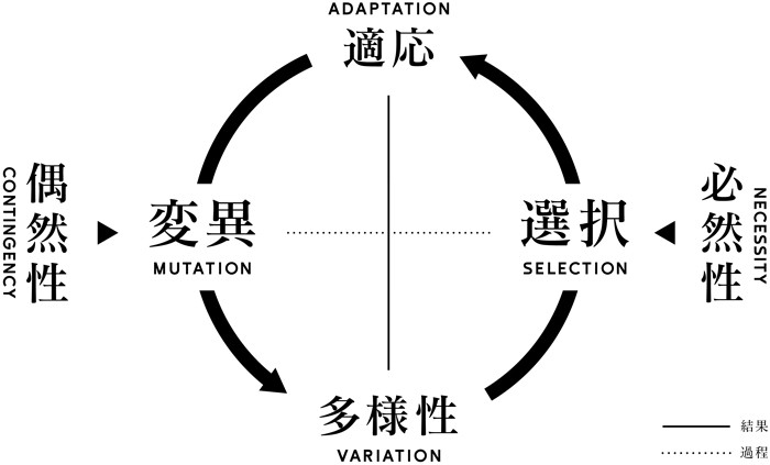 エラーによる変異が多様性を生み、その中から必然性によって選択されたものがより適応したものとして生き残り、その形質が遺伝して次世代の変異につながるというサイクルは、生物進化と創造的思考に共通している。