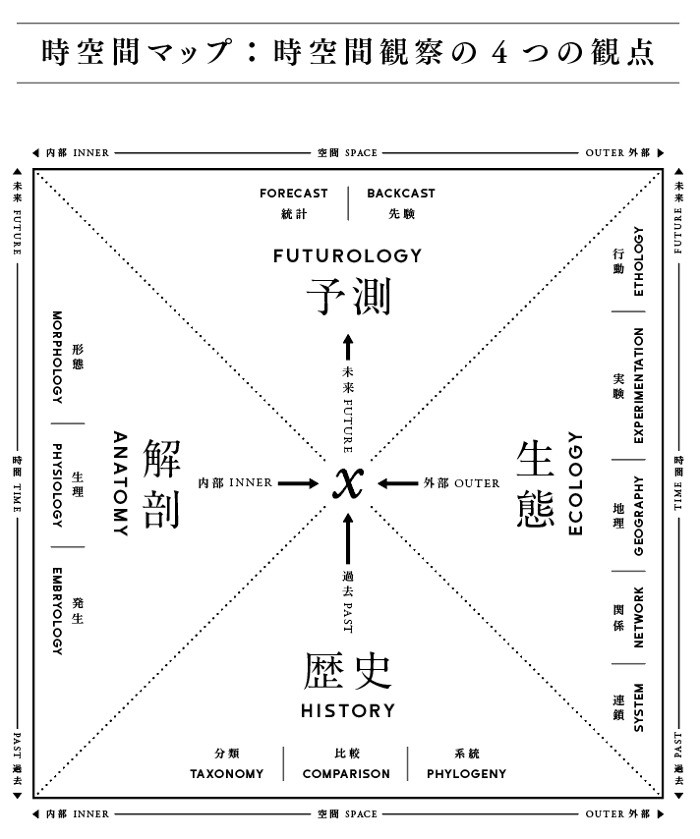 この「時空間的観察」によって、これまで生命科学が適応を観察してきたように、創造においても様々な選択圧が観察可能になる。4つの観点で適応を分析すると、時間的・空間的にもれなく関係性を考察できる。まず目に見えるものを分解するように解剖的観察から始め、次にすでに知られている事実を学ぶことで歴史的に観察する。これらをもとに、モノやヒトの繋がりに対する生態学的な観察をする。これらの3つの観察は未来の予測の精度を上げてくれることだろう。