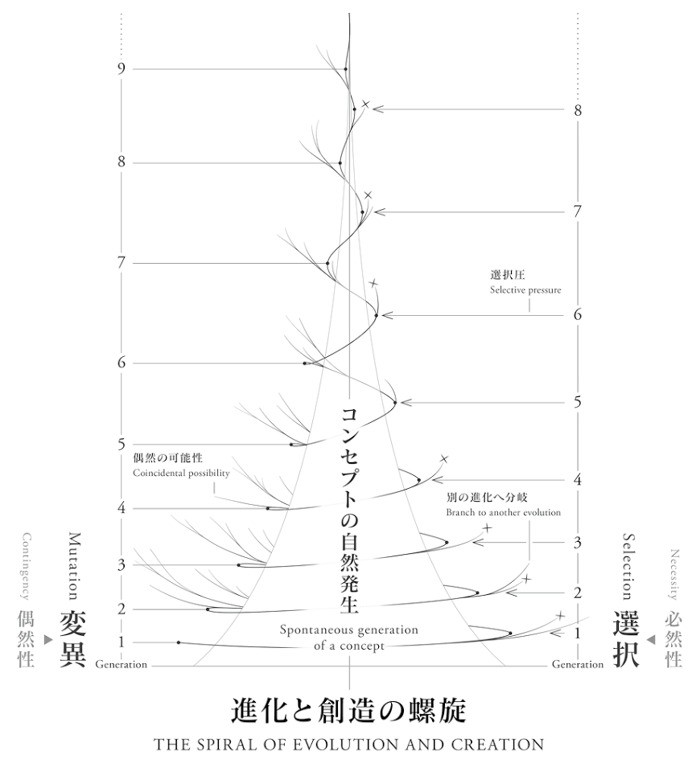 変異と選択を繰り返し、収斂した先に、創造が誕生する。選択の方向性に適った変異が見つかると、そこに生まれた方向性に名前がつけられ、コンセプトが誕生する。粘り強い思考から見出されたコンセプトは、時代の共感を伴って、社会を変えることさえあるだろう。