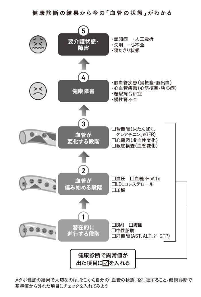 健康診断の結果から血管の状態を推測するにはどうすればいいか。血管の傷みは、次の5つの段階を踏んで進行していく。健診で異常値が出た項目をチェックするだけで、自分の血管がどのくらい傷んでいるかがわかるのだ。