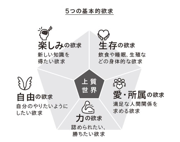 選択理論では、人は生まれながらに5つの基本的欲求(生存、愛・所属、力、自由、楽しみ)を持っていると考える。そして、5つの欲求を満たすイメージ写真が蓄積されたアルバムのようなものを「上質世界」と呼ぶ。