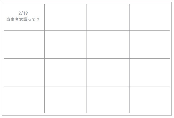 4×4のフレームが完成したら、左上の枠(第1フレーム)に日付とテーマを記入する。ここでのテーマは「当事者意識とは何か?」だ。
