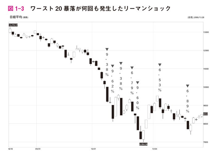 株価暴落は、大きな値下げが一度きて終わりだと思われがちだが、実は何度も下落する。例えばリーマンショックは、暴落と上昇を何度も繰り返した。